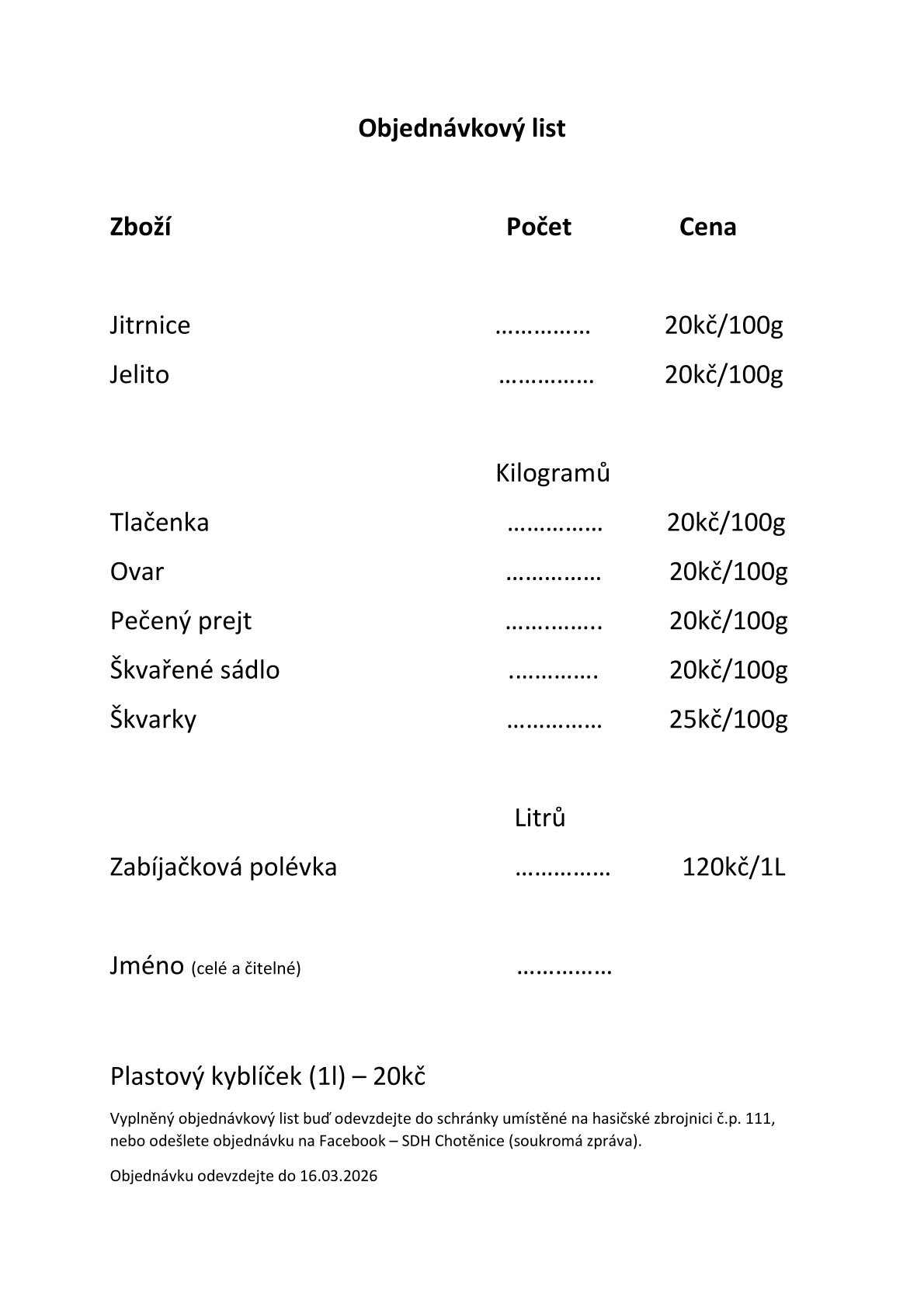 V případě, že máte zájem o objednávku vhazujte objednávkové listy do schránky u hasičské zbrojnice v Chotěnicích. Případně můžete objednávat přes soukromou zprávu na FB SDH Chotěnice.